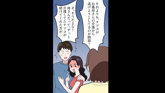 姉が無職だということを主人公が暴露すると、夫は姉を責めました。 すると姉は慌てて話を変え、主人公が介護から逃げることのほうが問題だと主張したのです。