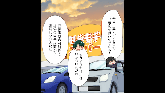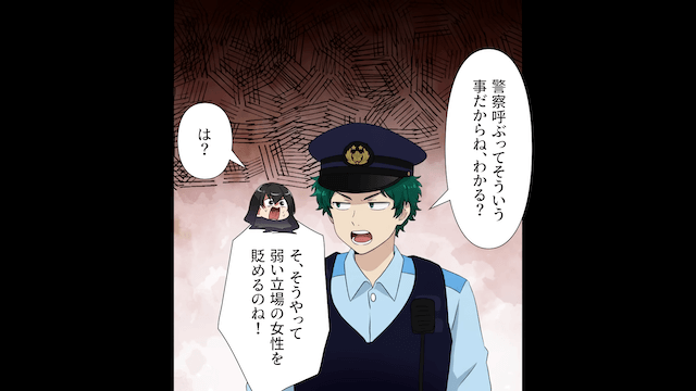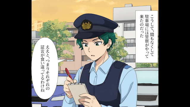 目撃者が主人公の味方になってくれたことで、主人公は冷静になり、店員に防犯カメラの有無を確認。 店員は警察同伴でないと防犯カメラを確認できないと言い、すぐに警察を呼びました。