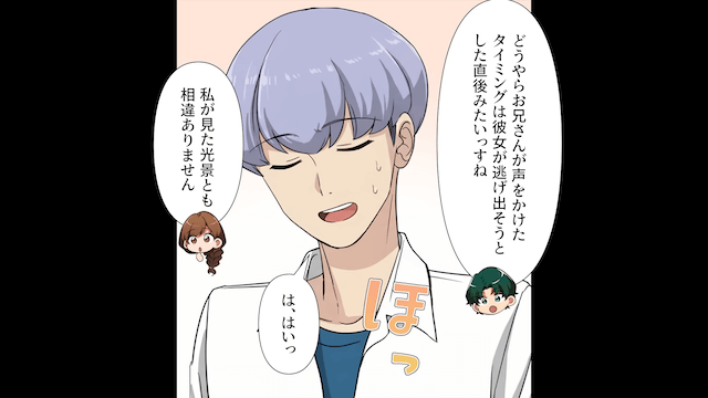 女性は再び立ち去ろうとしますが、警察に当て逃げになる可能性があると言われ、渋々事務所に移動。 そして警察が防犯カメラを確認すると、主人公の疑いが晴れました。