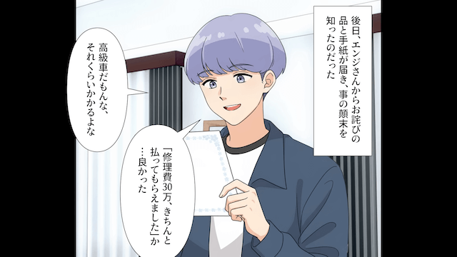 今回は『カートで車に突っ込んだ”よそ見女”の末路』を紹介します。 真実が明らかになり、男性から謝罪された主人公。 「わかっていただけただけで僕は充分ですから」と男性に言い、協力してくれた店員と目撃者に感謝したのでした。