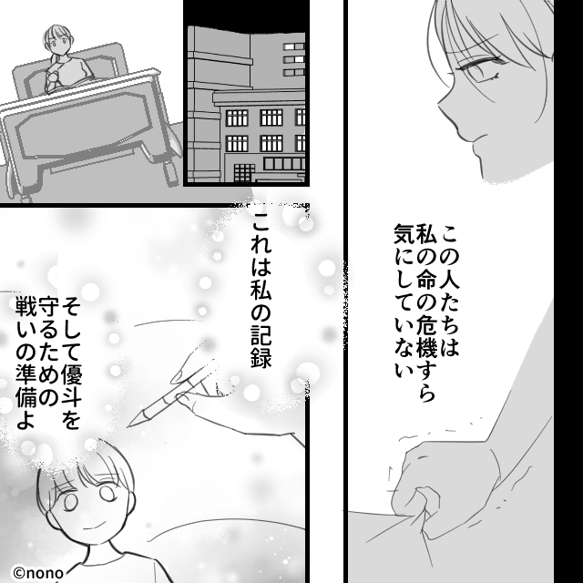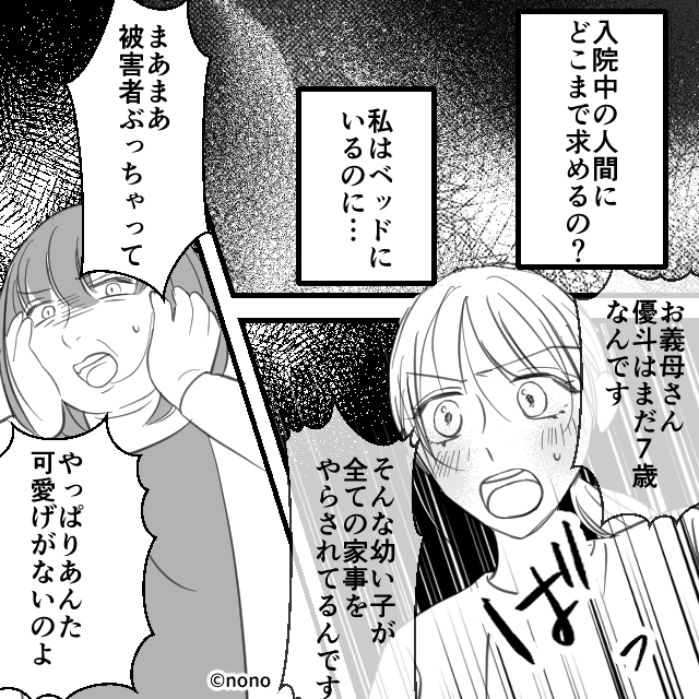 家事ができていないことを指摘し「母親として失格よ!」と入院中の主人公を責める義母。 主人公の命の危機すら気にしていない夫と義母に、主人公は怒りを感じるのでした。