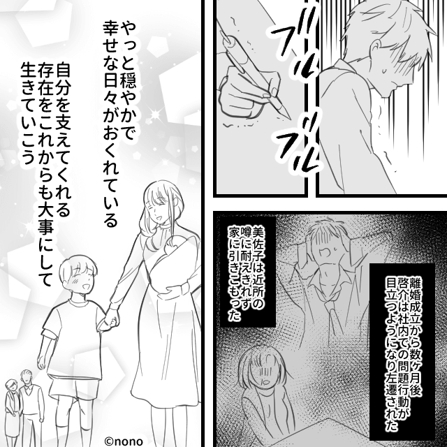 その後、夫は社内で問題行動を起こして左遷され、主人公は子どもたちと幸せに暮らしたのでした。