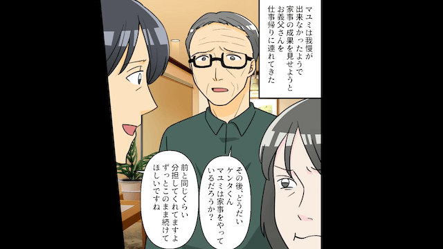 家事をしていないことを暴露された妻は、義父に怒られ、その後はきちんと家事を分担してくれるようになりました。 それから数日後、家事の成果を見せようとした妻は義父を家に連れてきたのですが、クローゼットから服がはみ出していて…。
