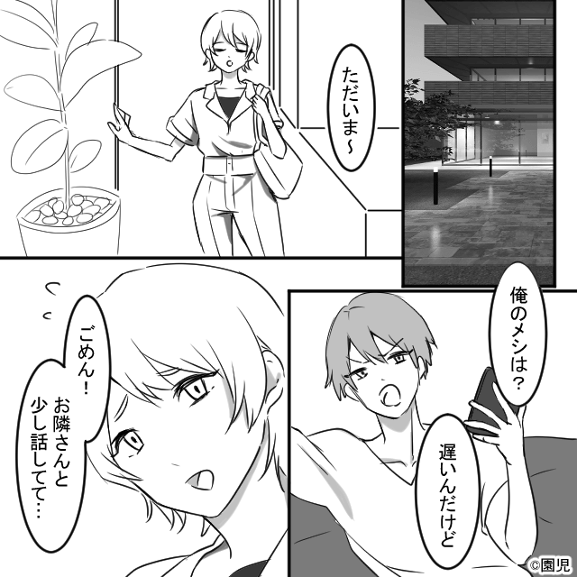 今回は『夫の転勤でタワマンに引越した結果…』を紹介します。 隣人と話し込み、帰宅が遅くなった主人公。 スマホを見ながら待っていた夫は「俺のメシは?」と主人公に文句を言い…。
