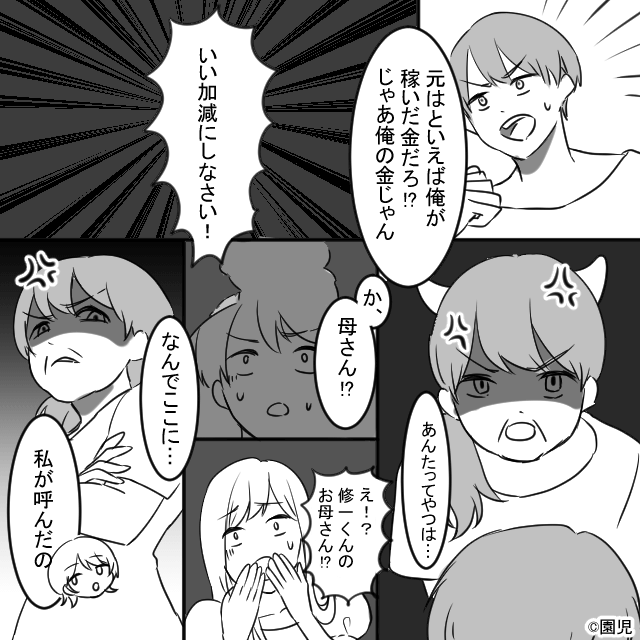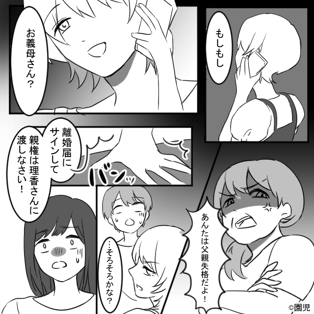 開き直って浮気を認めた夫は「親権は俺」と主張し、隣人と一緒に娘を育てると言います。 しかしそこに主人公が呼んだ義母がやってきて、夫は激怒されたのでした。