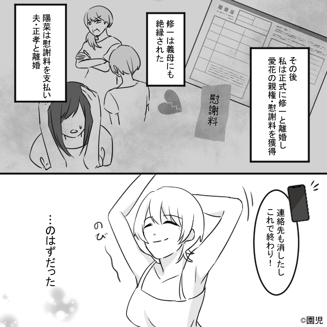 主人公が呼んだ隣人の夫もやってきて、隣人は離婚を突きつけられます。 その後、主人公は慰謝料と親権を獲得し、夫は元夫になったのでした。