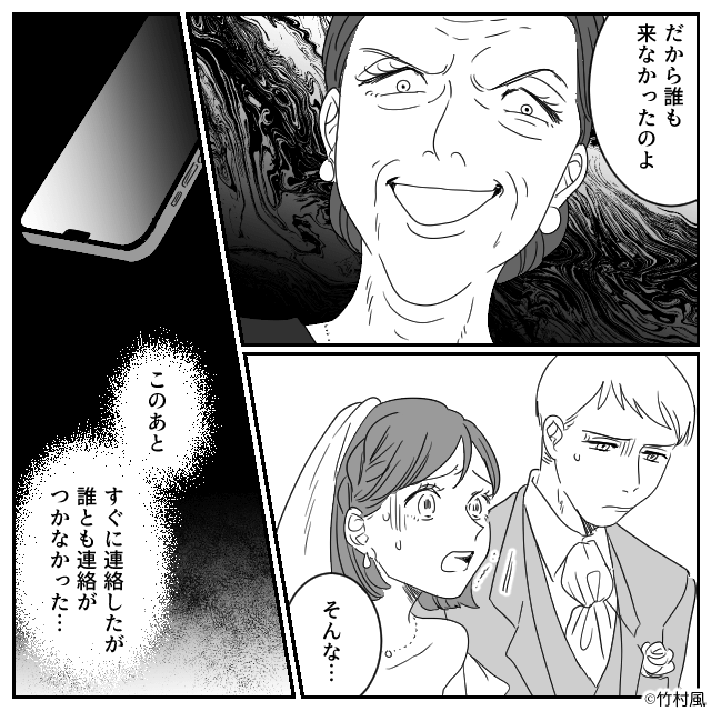 結婚式当日、主人公の親戚たちが全員欠席。 戸惑いショックを受ける主人公を見て、義家族は「あなたの身内はあなたのことを恥じているのよ」と笑うのでした。