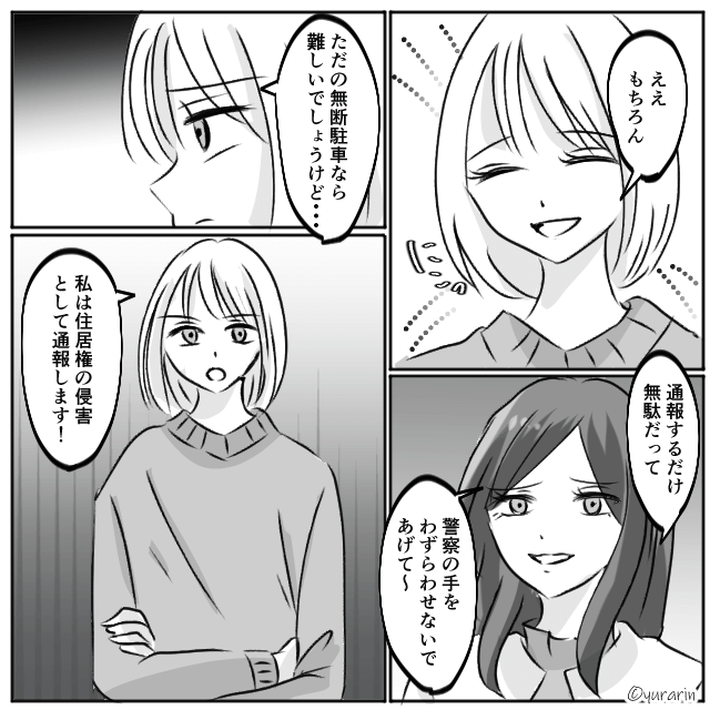 「警察はね〜民事不介入だから対応してくれないわよ?」と理解して無断駐車をしていた女性。 しかし主人公はそんな女性に「私は住居権の侵害として通報します!」と告げたのでした。
