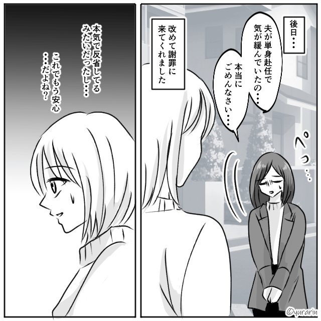 主人公が本当に通報する気だと知り、やっと反省して謝罪した女性。 女性は以前にもトラブルを起こしたことがあるらしく、次に警察沙汰になった場合は離婚をすると女性の夫に言われているようで…。