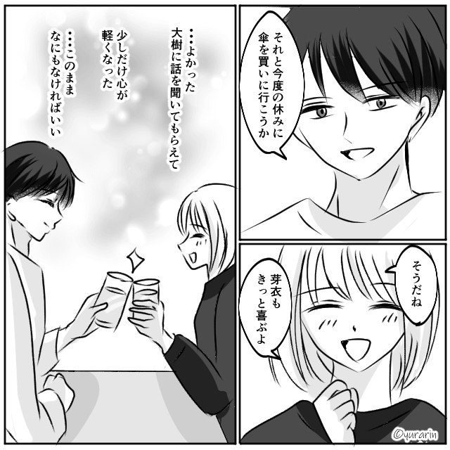 その日の夜、女性の問題行動を夫に相談した主人公。 傘だけでなく娘の自転車もなくなっていたため、主人公たちは盗難届を出すことにします。