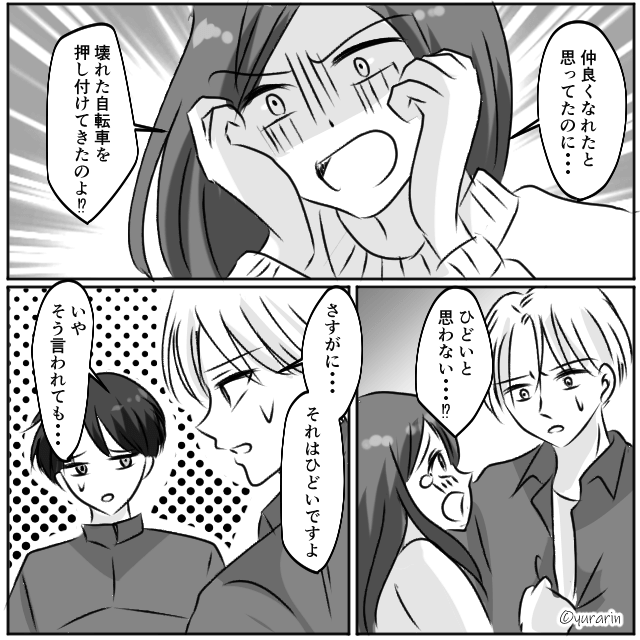 今回は『「警察は民事不介入よ?」無断駐車する女を撃退した話』を紹介します。 娘の自転車を持っている女性に「この自転車は盗まれたはずです」と伝えた夫。 すると話を聞いていた女性の夫が「どういうことですか?」と聞いてきて…。