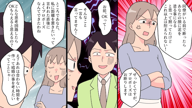 主人公がそれを拒否すると彼氏がまた身勝手なことを言ってきたため、主人公は同僚たちの前でプロポーズをはっきりと断ったのでした。