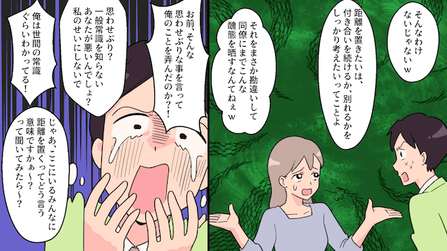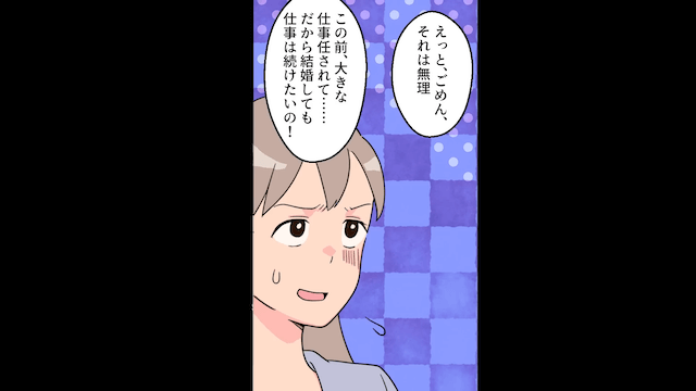主人公が関係を考え直したいと彼氏に告げた数日後、なんと彼氏は同僚たちの目の前でプロポーズをしてきました。 そして勝手にプロポーズが大成功だと思い込んだ彼氏は、主人公に仕事をやめるよう要求してきたのです。