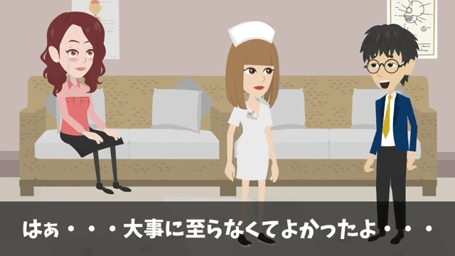 主人公の姿を確認した母は「心配かけてごめんね」と謝ります。 そして、看護師から説明を受けた主人公は「はぁ…大事に至らなくてよかったよ…」と安心しました。