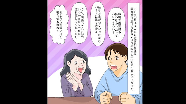 元夫と義母と浮気相手は責任転嫁をし合い、自ら証拠を出し合います。 その結果、主人公は無事に慰謝料を徴収することができたのですが…。