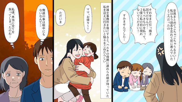 元夫の会社の重要取引先に勤めている夫は、元夫の会社との取引を中止しました。 そして元夫は閑職に追いやられて自主退職し、義母は名誉棄損で罰金50万円、浮気相手は慰謝料100万円を支払うことになったのです。