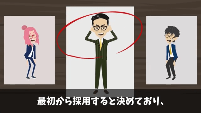 面接官の態度から、主人公はこの面接が談合なのだと気づきました。 この面接では最初から眼鏡の男性だけが採用されると決まっていたのです。