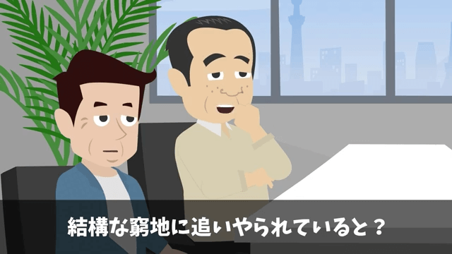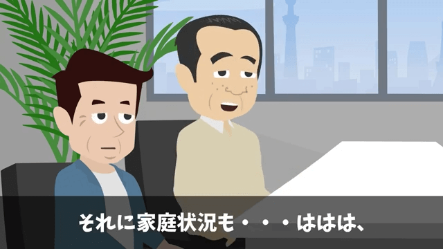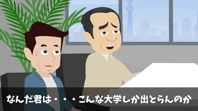面接官は「こんな大学しか出とらんのか」と主人公の出身大学をバカにしてきました。 さらに主人公の家庭状況についてもバカにしたように笑い…。
