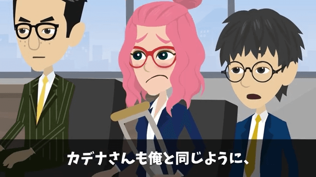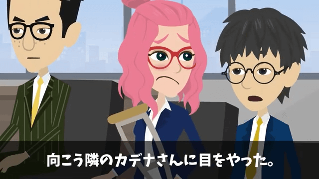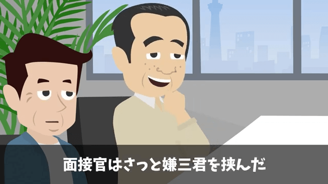 主人公の話を聞いた面接官は大笑いし「君は帰っていいよ?」と言ってきました。 そして面接官は松葉杖の女性のほうに目を向けます。