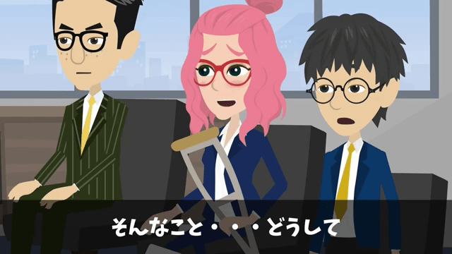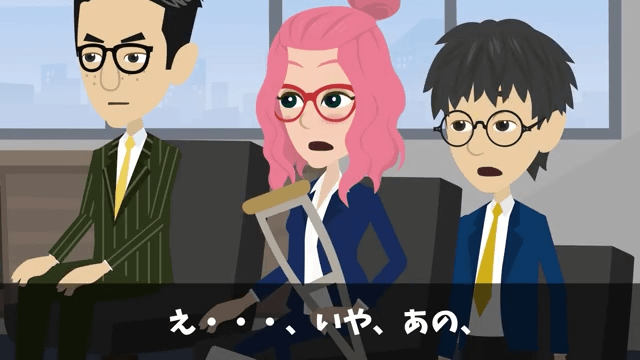 面接官は、先日も女子社員が会社を辞めてしまったことを説明しました。 さらに面接官が面接とは関係ない質問をしてきたため、松葉杖の女性は「そんなこと…どうして」と困った表情を見せます。