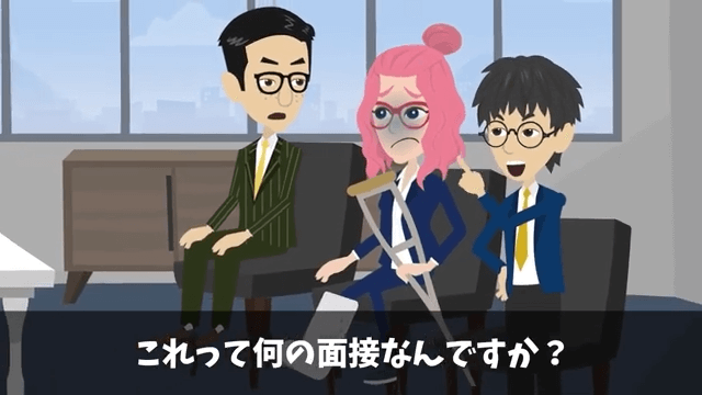 我慢できなくなった主人公は、面接官に向かって「さっきから聞いていたら何なんですか!」と怒りました。 そして「これって何の面接なんですか?」と面接官を問い詰めます。