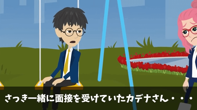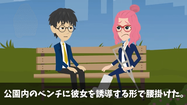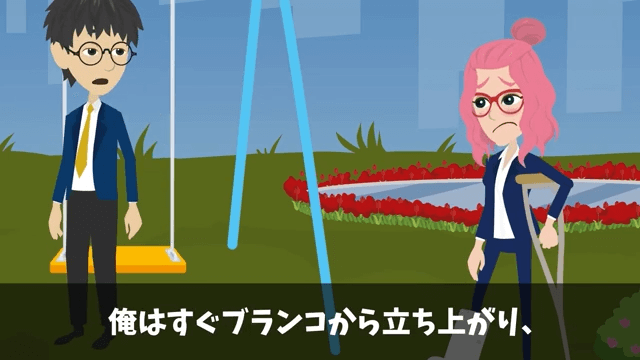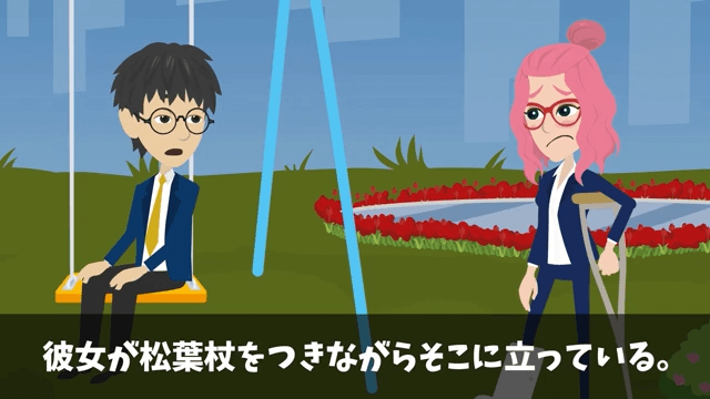 主人公が公園のブランコに座っていると、後ろから声をかけられました。 そして振り返ってみると、先ほどの松葉杖の女性が立っていたのです。