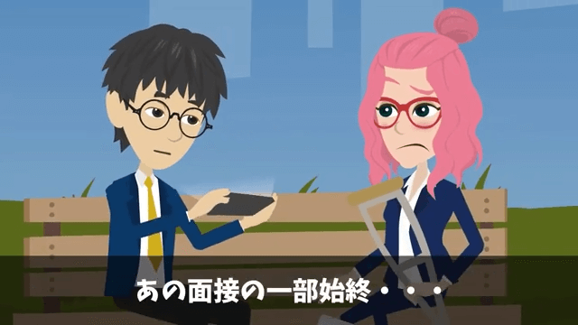 ずっとスマホの動画モードがオンになっていたことに気づき、主人公は電池残量を確認します。 するとそのとき、先ほどの面接の一部始終が録画されていることに気づいて…。