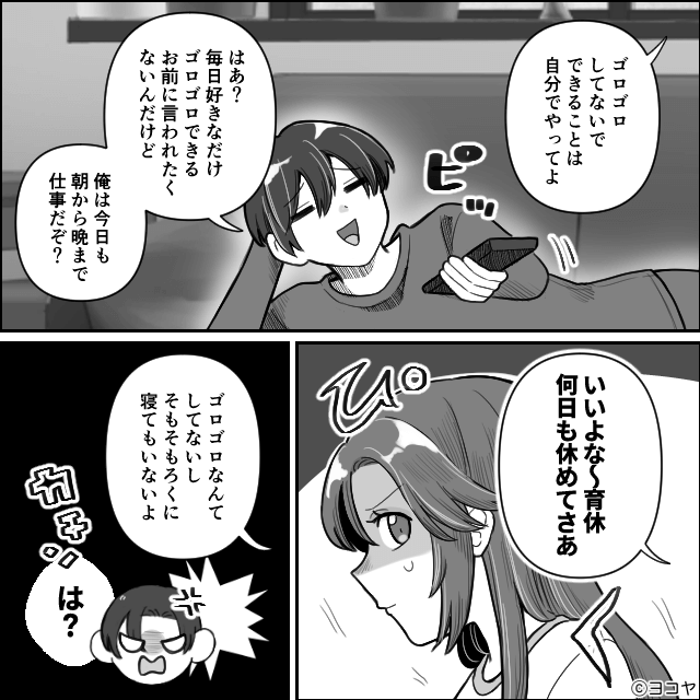 子どもの夜泣きで何度も起こされ、疲弊していた主人公。 しかし夫は主人公の育休をただの休日だと思っているようで、主人公にイヤミを言うのでした。