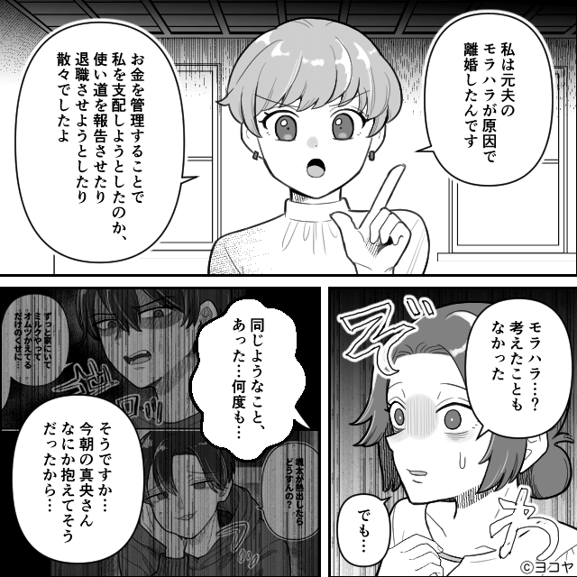 後輩に夫のことを聞かれ、はぐらかしつつ説明した主人公。 するとモラハラが原因で離婚した後輩は、主人公も同じ状況に置かれていることに気づきます。