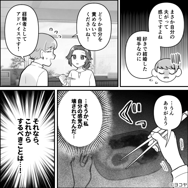 後輩の話を聞いて、夫がモラハラ夫だと知った主人公は、ある決意をして…。