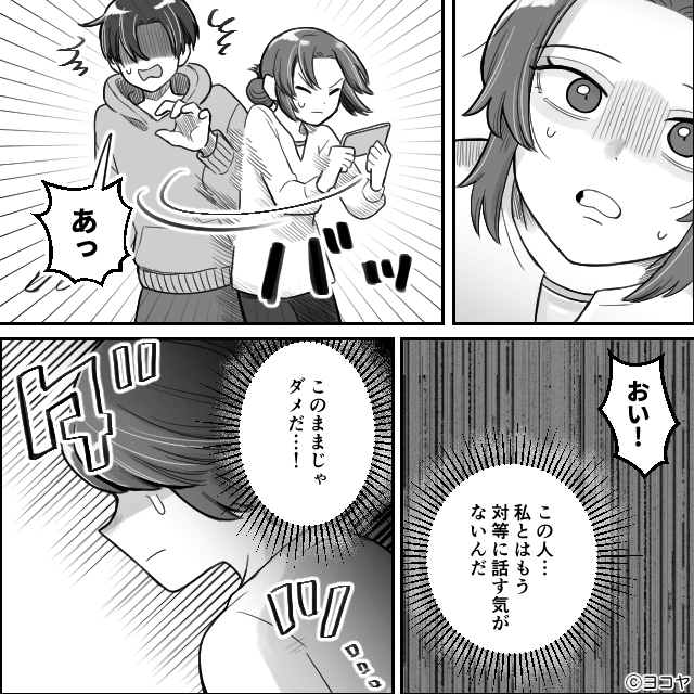夫は「あーうぜぇな…」と主人公の通帳を奪おうとしますが、主人公は抵抗して…。