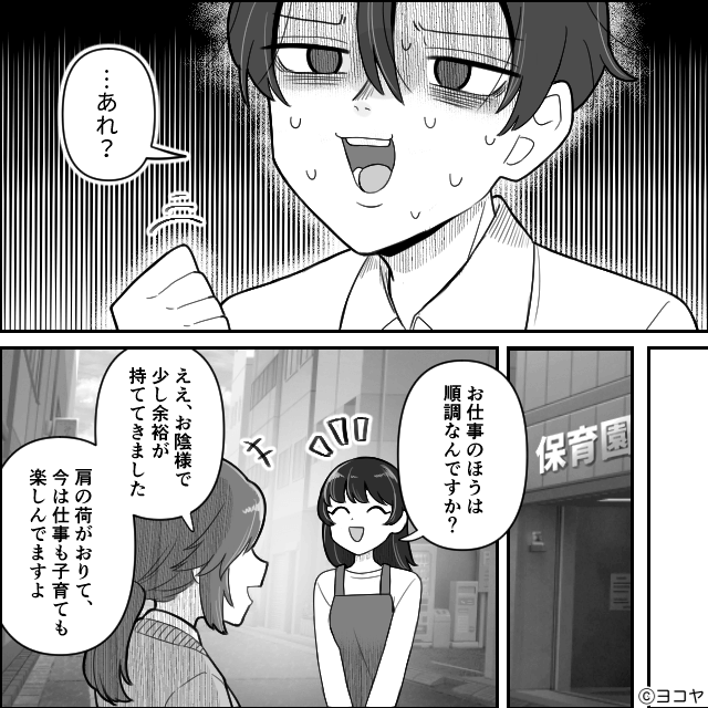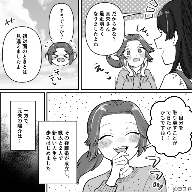 男性の同僚に「その考えとか発言とかさすがにやばくないっすか?」と言われ、周りにも白い目で見られ、青ざめた夫。 その後、無事に離婚が成立し、夫は元夫となったのでした。