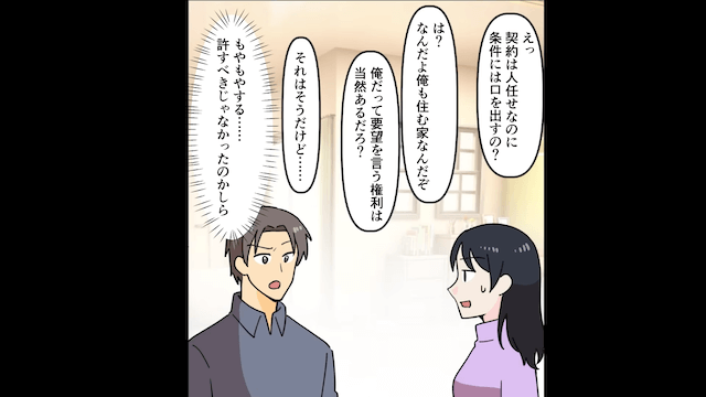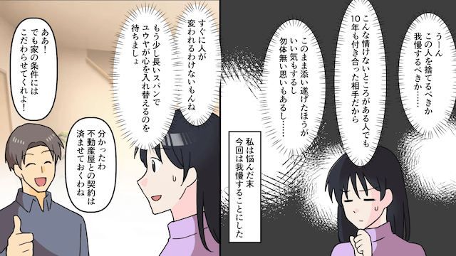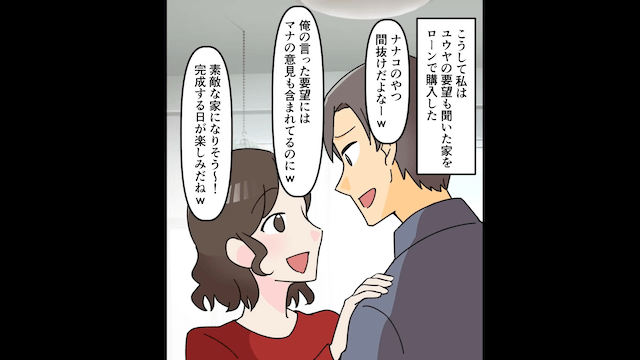 浮気相手と話し合い、自分と浮気相手が住む新居を主人公に購入させることにした彼。 新居購入の手続きを丸投げされた主人公は彼にイライラしますが、その後、新居をローンで購入したのでした。