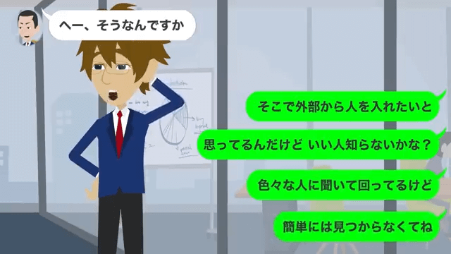 主人公は男性社員に新しい部署を作ろうとしていることを伝えます。 そして、その部署の部長クラスにふさわしい人がいないか男性社員に尋ねました。