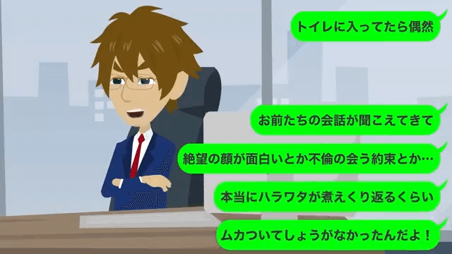 今回は『入社式に行くと→受付「名前がないですよ?」内定していなかった話』を紹介します。 主人公は、部長と男性社員の浮気に気づいたとき、あることを思い出したと話します。 そして主人公は部長に「あなた昔、内定の嘘の電話してましたよね?」と尋ねました。
