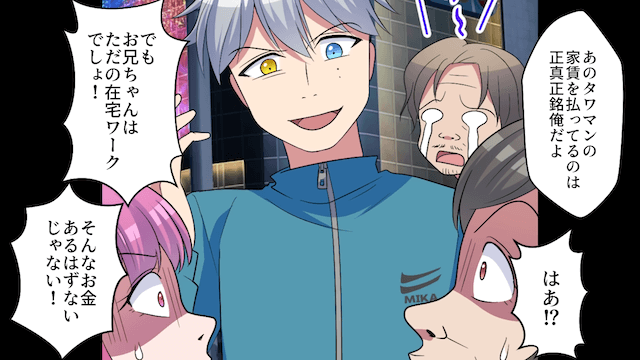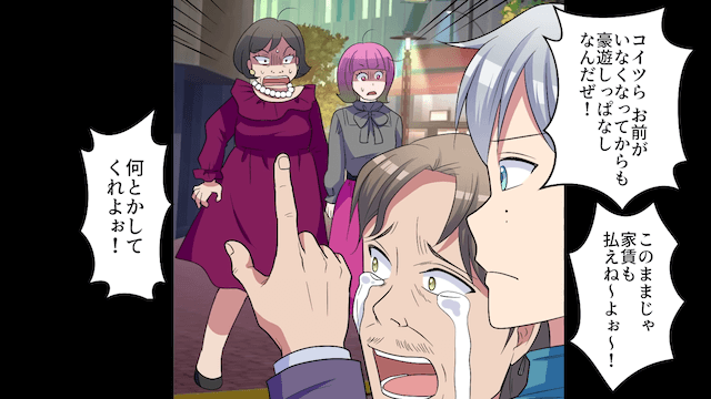 母と妹は主人公がいなくなったことに大喜びしていました。 しかし父が主人公にすがりついて助けを求めたことで、母と妹は困惑。