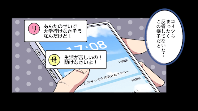 今回は『妹を溺愛する両親「手取り10万のお前は家族じゃない(笑)」⇒お望み通り絶縁した結果』を紹介します。 心を痛めることもなく、主人公を邪険に扱い続けた母と妹。 そんな2人に主人公は「俺だって同じだ」と伝え、妹の人生なんてどうでもいいと突き放したのでした。