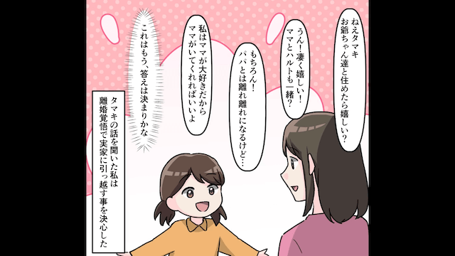 娘も「ママがいてくれればいいよ」と言ってくれたため、主人公は離婚を覚悟で実家に引越すことにしたのでした。