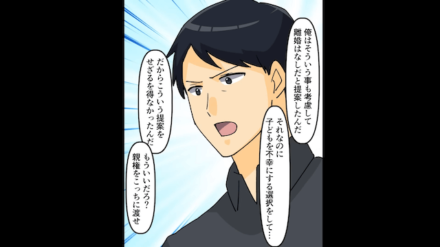 今回は『出産直後からなぜか私をフル無視する夫の末路』を紹介します。 親権を求めて「君には子どもへの責任感が欠けてるんだよ」と主人公を責めてきた夫。 主人公はそんな夫に「あなたにだけはそんなこと言われたくないわ!」と言い返すのでした。