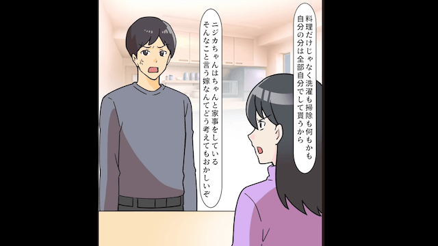 共働きにもかかわらず一切家事をせず、家事が上手な義姉と比べてくる夫。 主人公はそんな夫に我慢の限界で、自分の家事だけをすることにしたのでした。