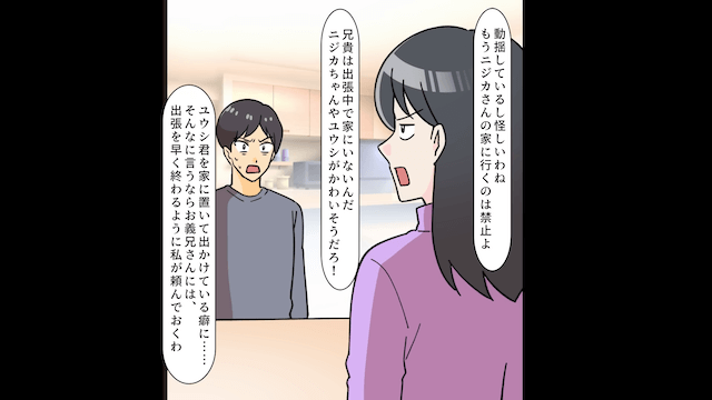 義姉も夫の来訪を歓迎していたため主人公がなにも言えずにいると、それから夫は頻繁に義姉の家に行くようになりました。 そんなある日、出張中の義兄から主人公のもとに電話がかかってきて、夫と義姉が甥を置いて2人で出かけていることや義姉がカードを使い込んでいることを知らされたのです。