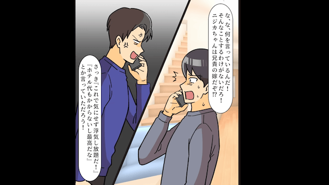 今回は『兄嫁が1ヶ月泊まりに来たので、言う通り家を出ていった結果』を紹介します。 主人公が甥を連れて家を出たことで「これで気にせず浮気し放題だ!」と大喜びする夫と義姉。 そこに義兄から電話がかかってきて、夫は悪びれる様子もなく電話に出たのですが…。