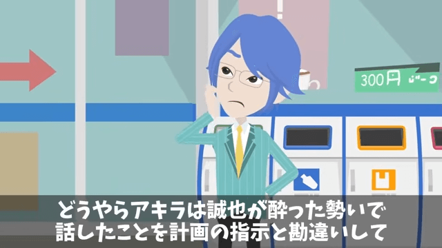 幼なじみがお酒の勢いで言っただけだと説明すると、部下は「えぇっ!そうだったんですかぁ!?」と驚きました。 どうやら部下は、幼なじみが酔った勢いで話したことを計画の指示と勘違いしたようで…。