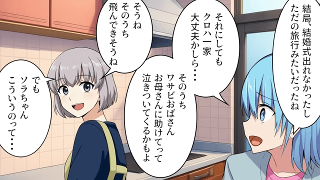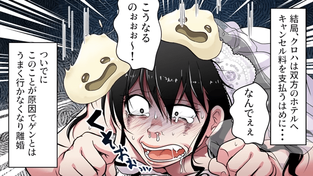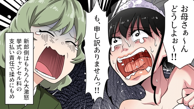 結局、いとこは双方のホテルにキャンセル料を払うことになり、夫とも離婚することに。 そして、実は母が叔母たちを恨んでいたことを知った主人公は「お母さん!?」と驚くのでした。