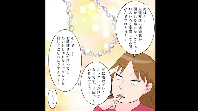 頻繁に家にやってくる義妹について悩んでいた主人公。 そんなある日、友人の結婚式があるからと、義妹にネックレスを貸してほしいと頼まれます。
