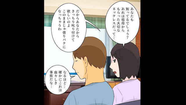 結婚式を過ぎてもネックレスを返しに来ない義妹に主人公が返却を求めると、義妹は逆ギレしてきました。 困り果てた主人公が夫に相談すると、夫は「いっそのことあげちまったことにすればいーんだよ!」ととんでもないことを言い出して…。