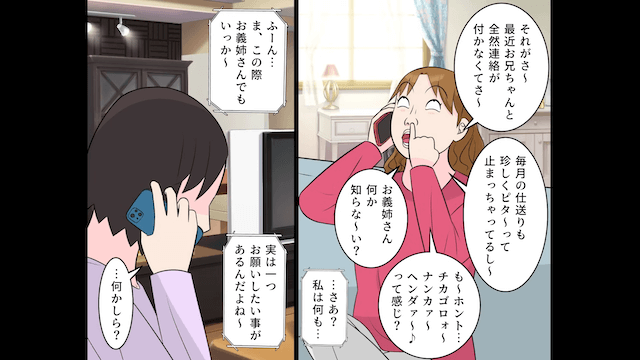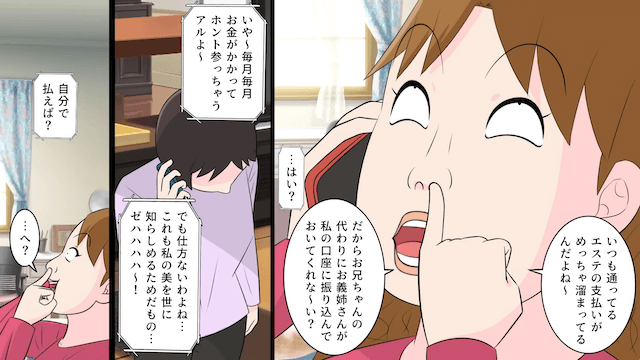 ある日、義妹からエステ代を代わりに支払ってほしいと頼まれた主人公は、きっぱりと拒否しました。 すると義妹は怒り出し、主人公は「かかってきなさいよ」と挑発して電話を切ったのです。