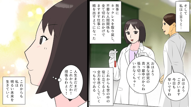 ネックレスを売ろうとしていた義妹は、執行猶予つきの懲役刑が科されます。 一方、主人公は不要な人間関係が切れたおかげで、仕事に精を出すようになったのでした。