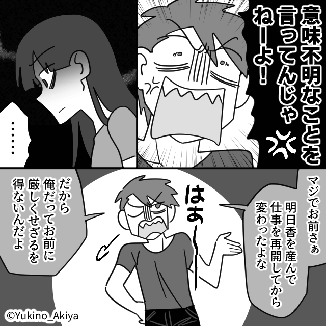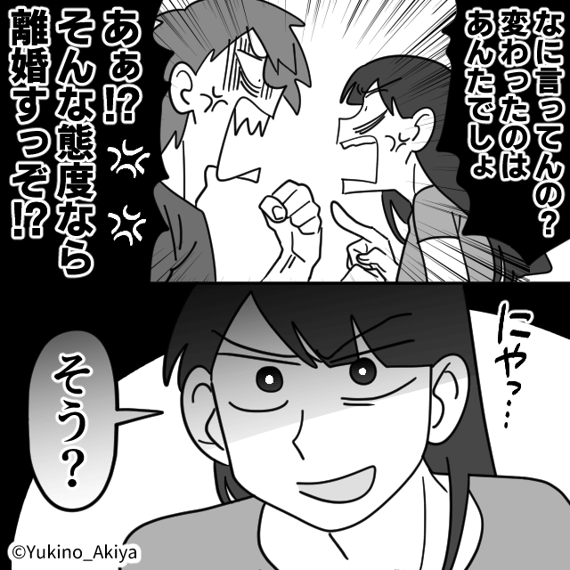 翌日、実家に夫がやってきましたがまったく反省しておらず、主人公は絶句。 主人公が夫の言葉に言い返すと、夫は「そんな態度なら離婚すっぞ!」と脅してきたのでした。