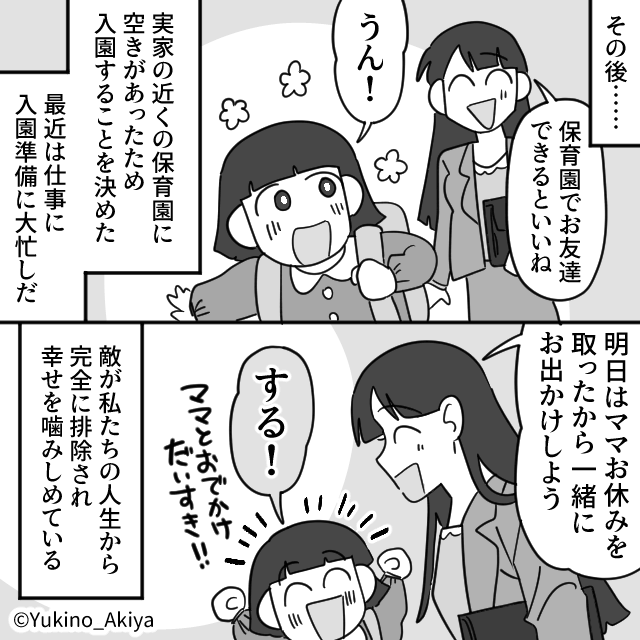 結局、主人公夫婦は離婚手続きを進め、主人公は娘と幸せに暮らしたのでした。